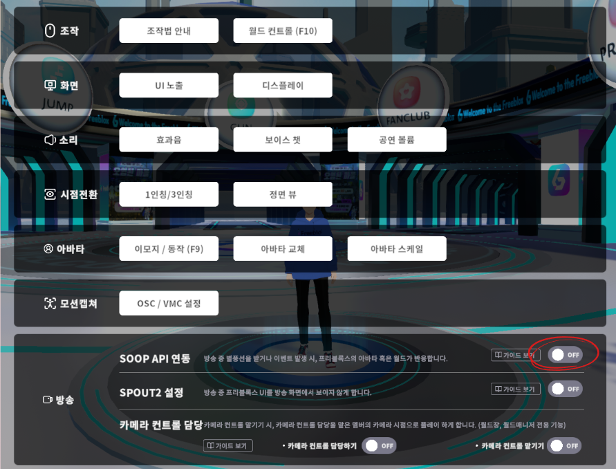 * 월드 공간 입장 후 ESC 메뉴 호출 및 방송 항목에서 활성화 시킬 수 있습니다