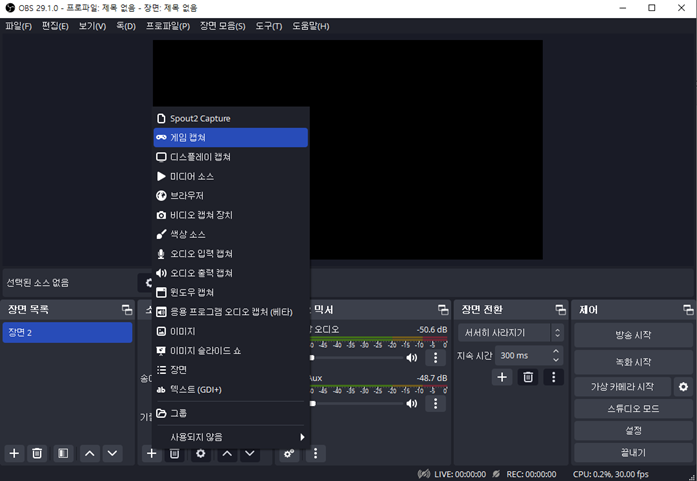 2️⃣ 소스목록 > 하단 ‘+’ 클릭 > ‘게임캡쳐’ 선택