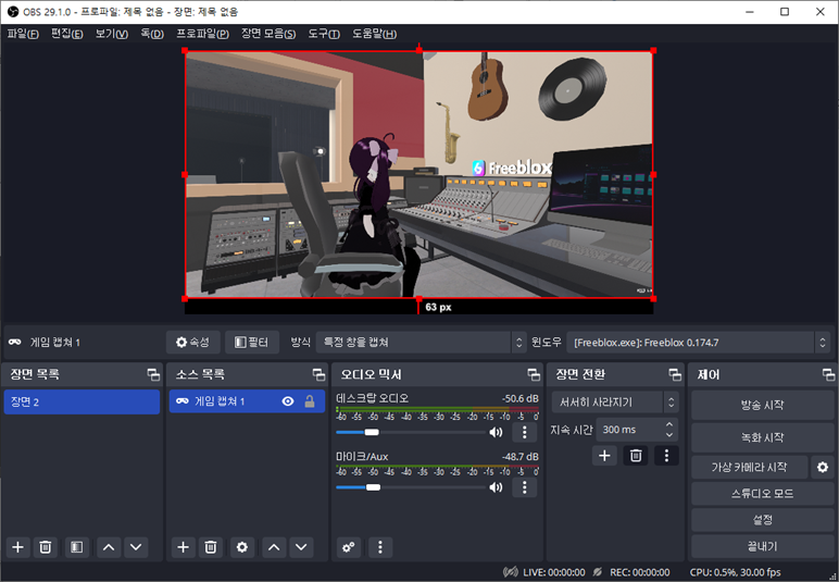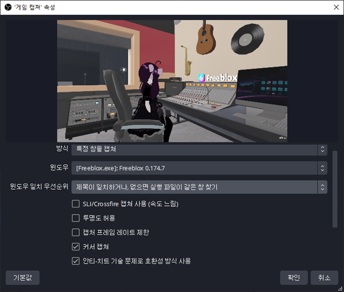 3️⃣ 팝업창에서 방식: 특정창을 캡쳐 / 윈도우: Freeblox.exe 선택