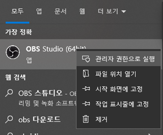 > OBS: 게임캡처 (관리자 권한으로 실행 필수) 또는 디스플레이 캡처 사용