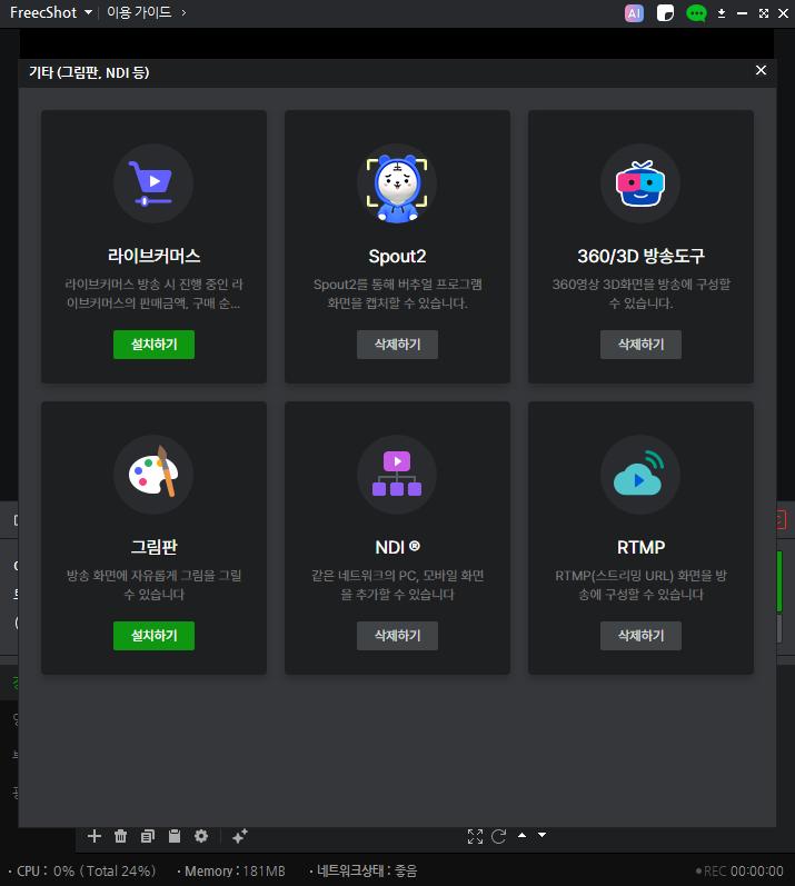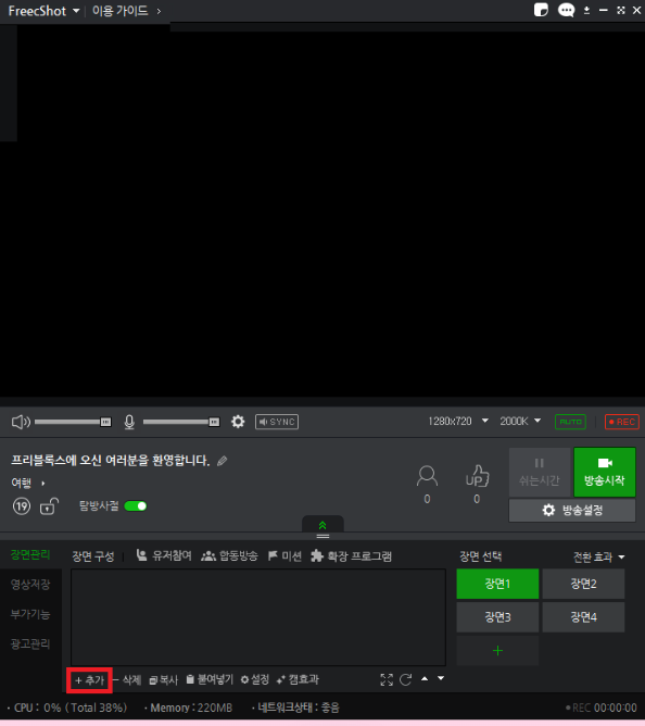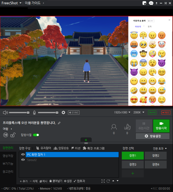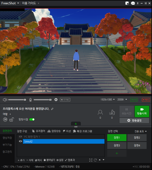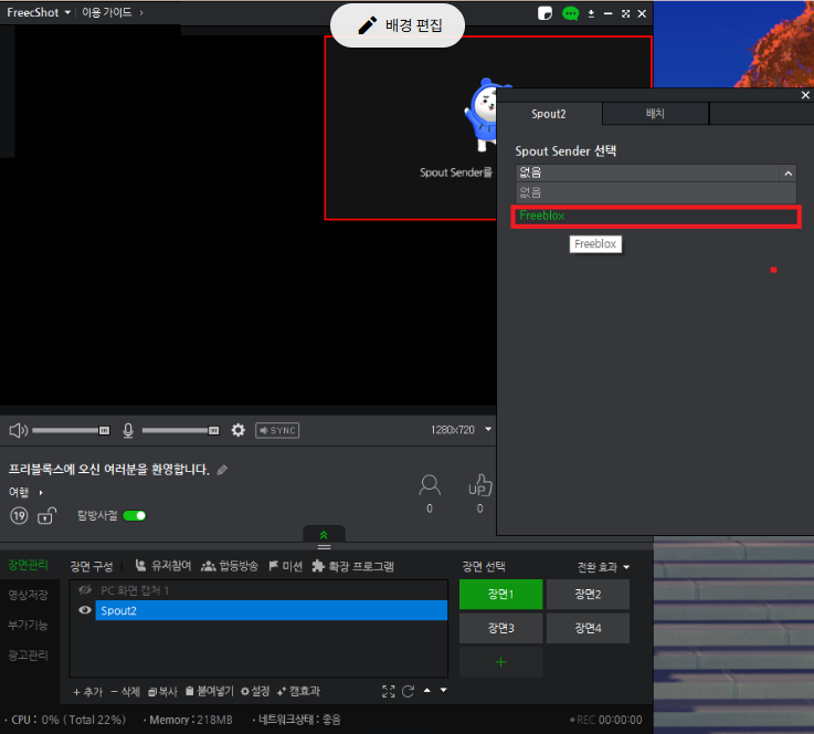 💡 프리블록스에서 spout 기능을 끄면 spout 화면은 종료되므로 spout 기능을 이용하시지 않을 땐 화면캡처나 다른 캡처를 통해 방송 화면을 잡아 주셔야 합니다.